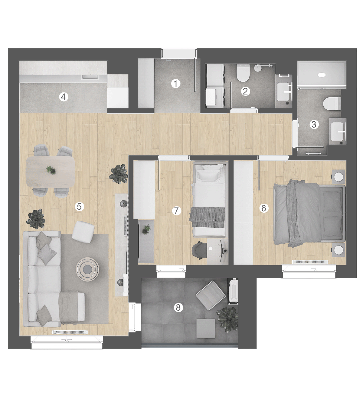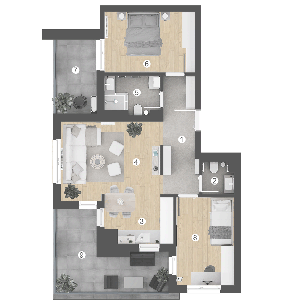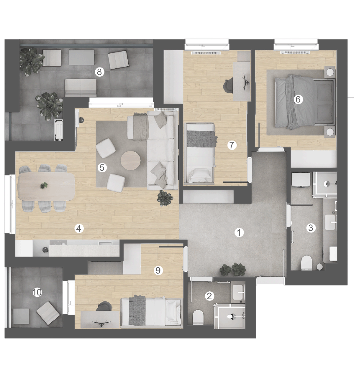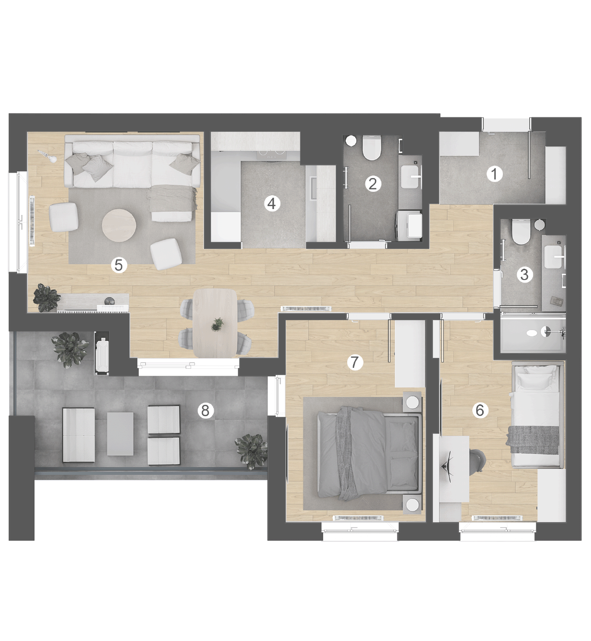 Stan sa tri spavaće sobe na uglu objekta koji je orjentisan prema vrbasu. Strukturu stana čine Dnevna soba, kuhinja sa trpezarijom, wc i toalet kao i tri spavaće sobe. Stan takođe posjeduje ogromnu terasu koja ima izlaz iz dnevnog boravka kao i još jednu lođu koja pripada dječijoj sobi.