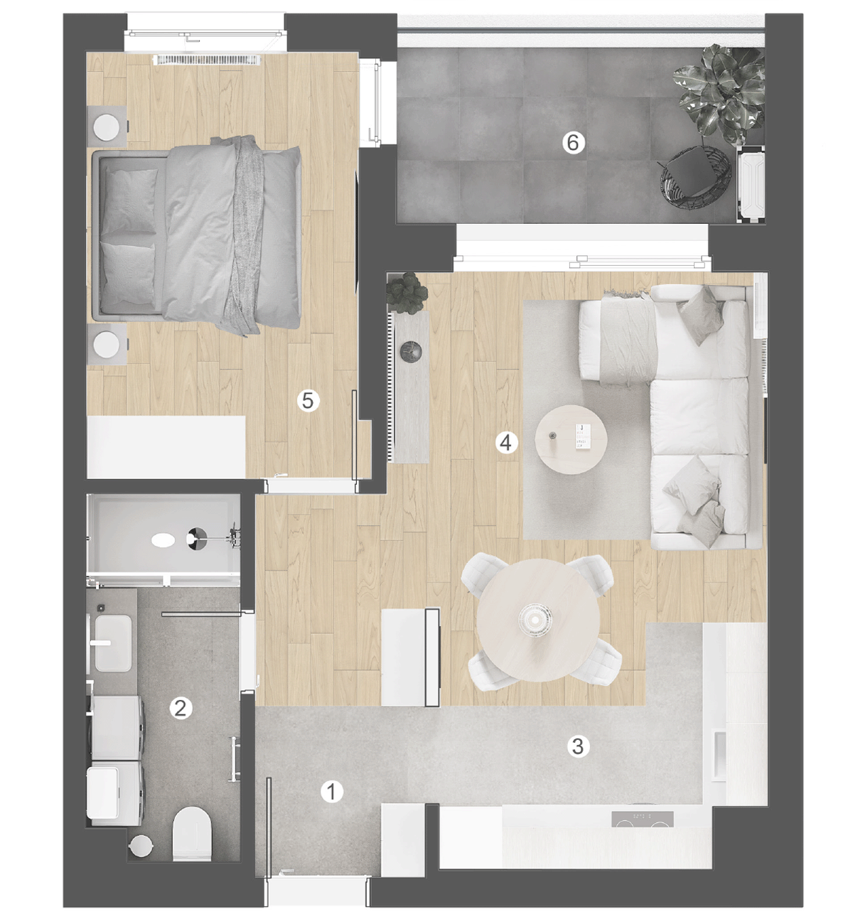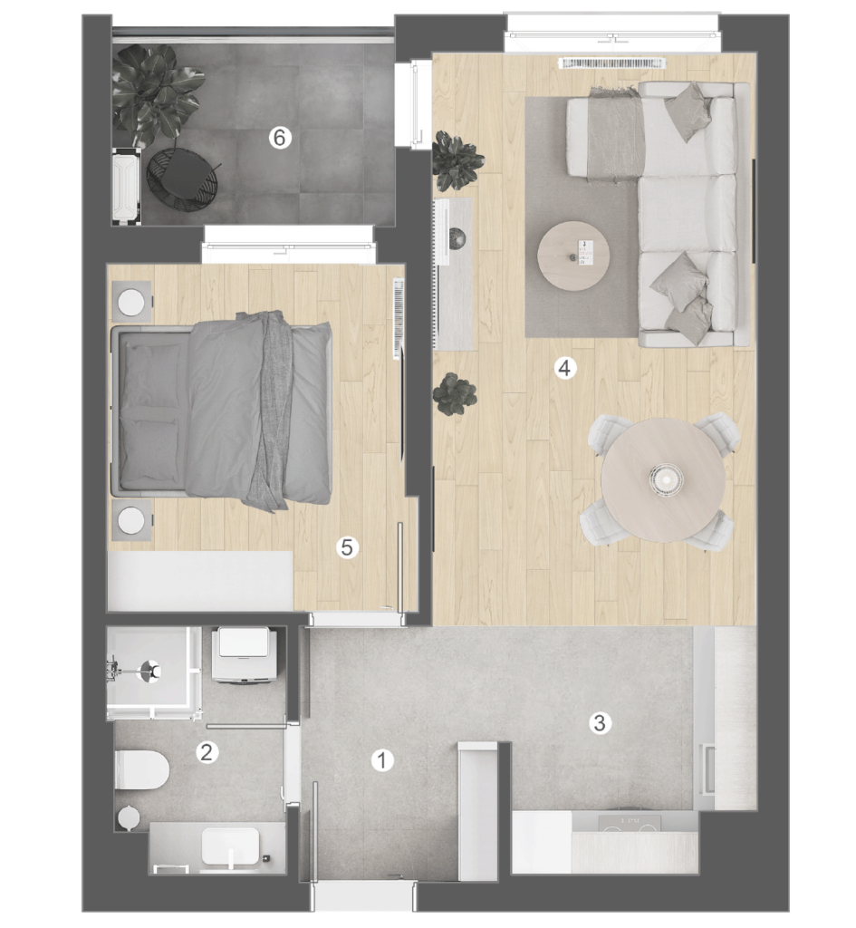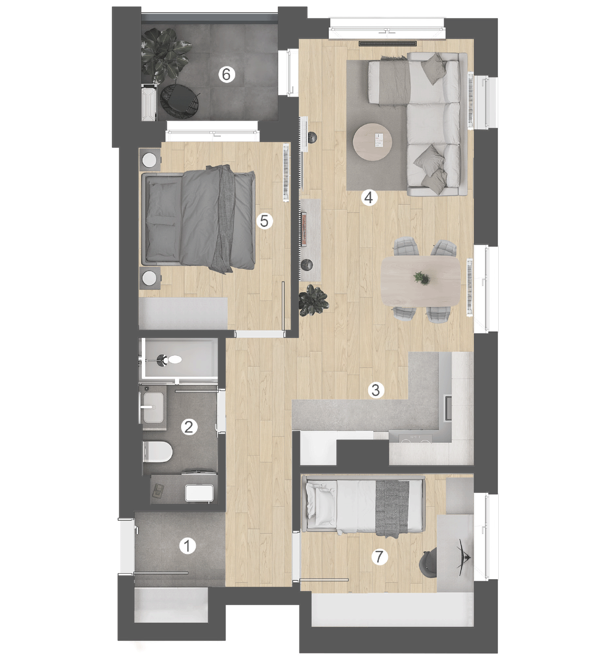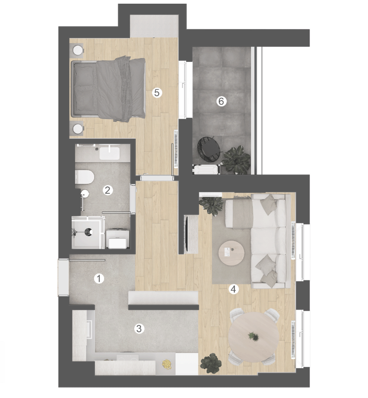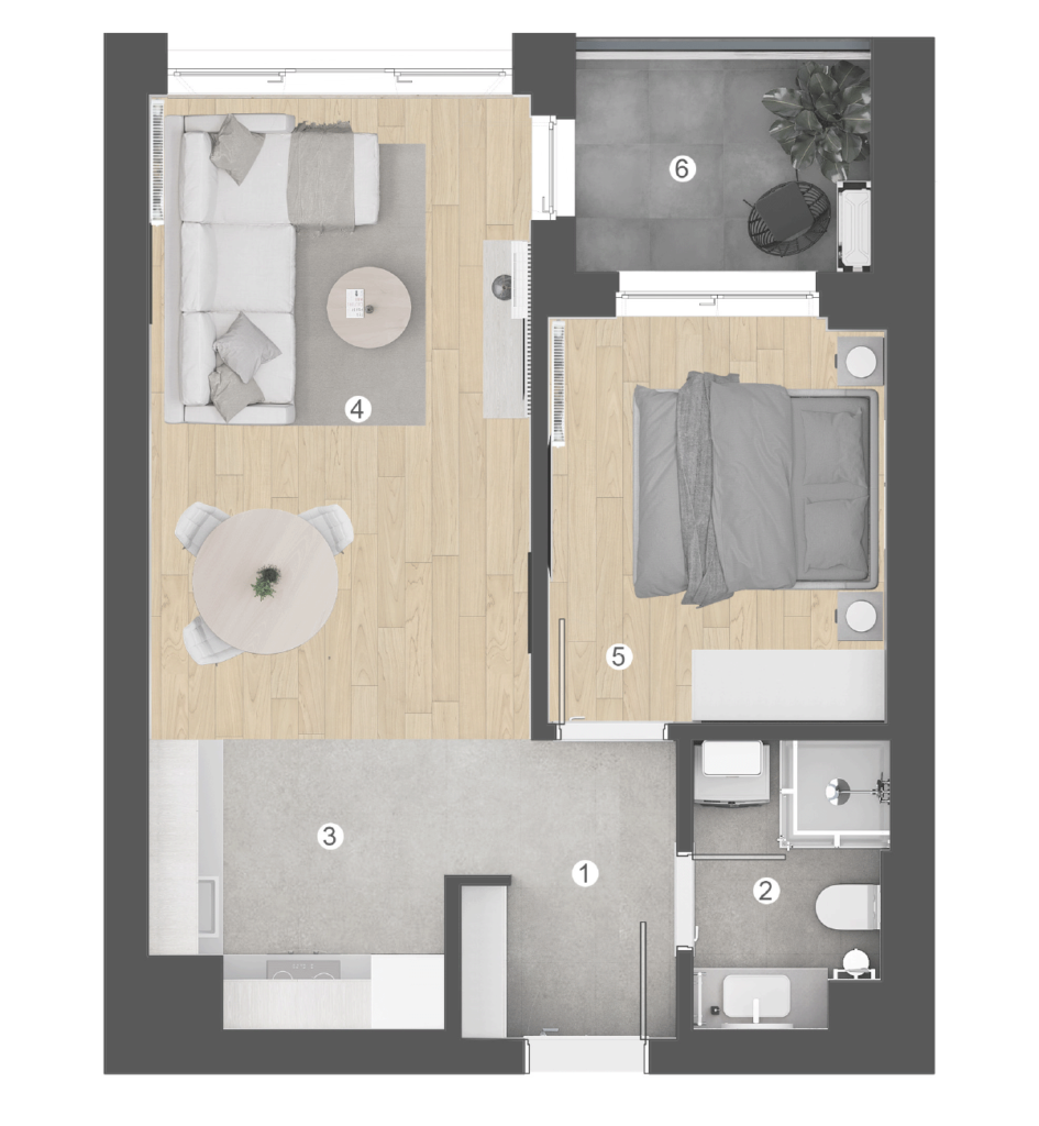 Stan sa 1 spavaćom sobom koji je orjentisan prema Ekonomskom fakultetu. Strukturu stana čine dnevni boravak, kuhinja sa trpezarijom, toalet i spavaća soba.Stan takođe posjeduje i lođu koja pripada master/roditeljskoj sobi.